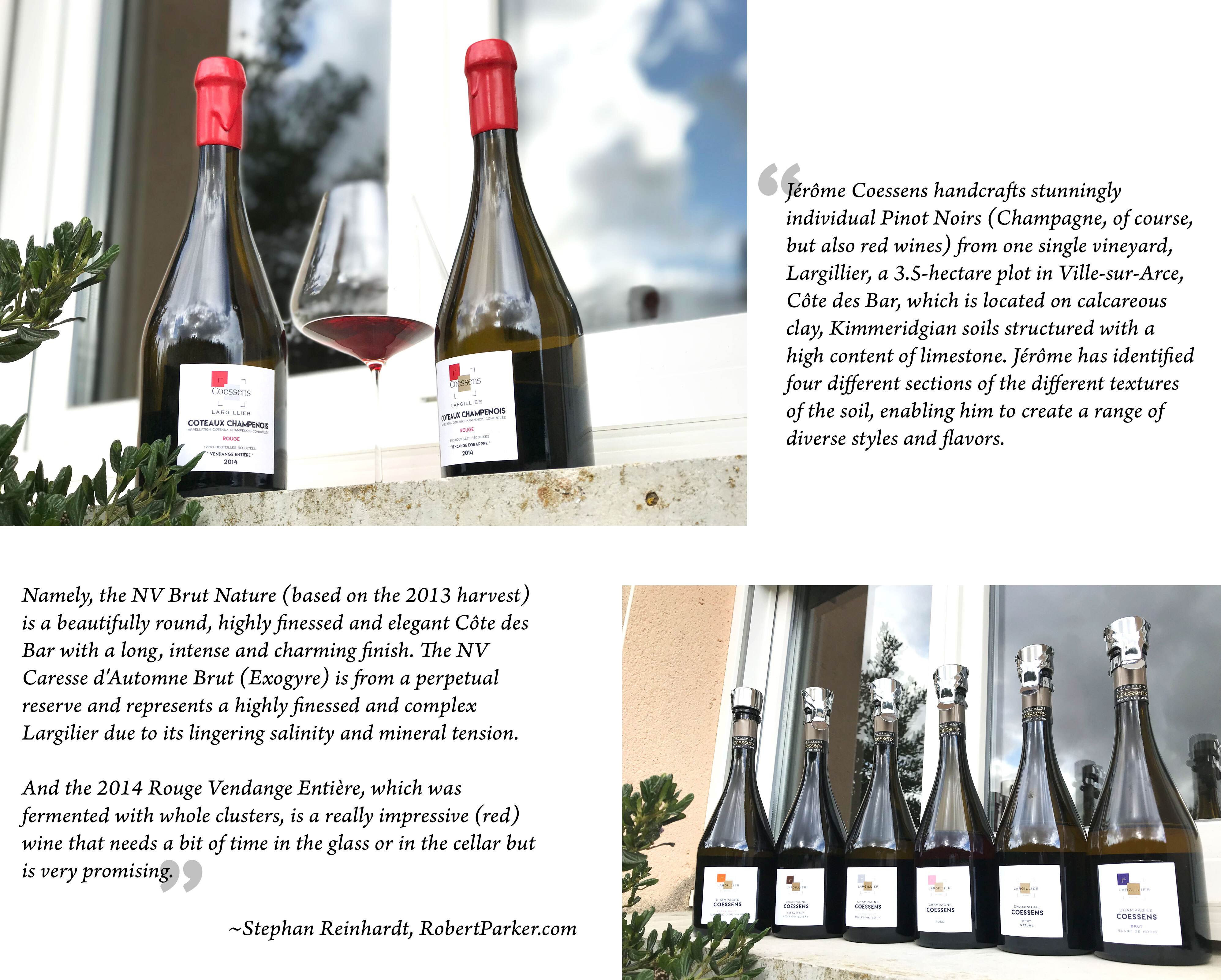 Jerome Coessens handcrafts stunningly individual Pinot Noirs (Champagne, of course, but also red wines) from one single vineyard, Largillier, a 3.5-hectare plot in Ville-sur-Arce, Cote des Bar, which is located on calcareous clay, Kimmeridgian soils structured with a high content of limestone. Jerome has identified four different sections of the different textures of the soil, enabling him to create a range of diverse styles and flavors managing a single Lieu-dix Largillier.